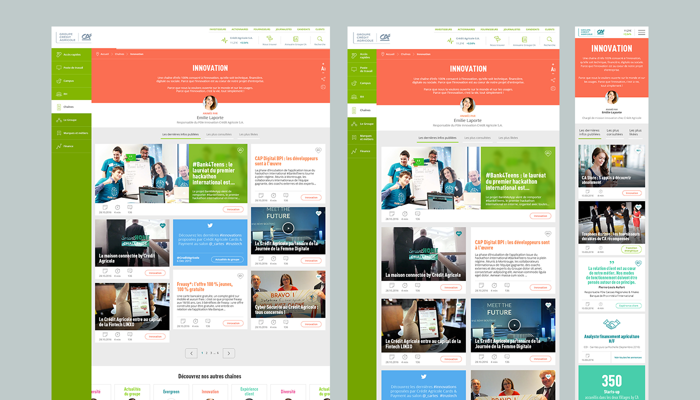 Refonte du site du groupe Crédit Agricole réalisé au sein de l'agence Babel. Conçu en responsive, il s'adapte aux différents tailles d'écrans jusqu'au mobile. La home forme un tableau qui regroupe des contenus provenants de différents sources d'informations car le site a d'abord été pensé comme un dashboard, présentant un grand nombre d'outils utiles aux professionnels du groupe. Une partie du site permet d'être consultable par le grand public, et toute une autre offre des services assimilables à un site intranet.