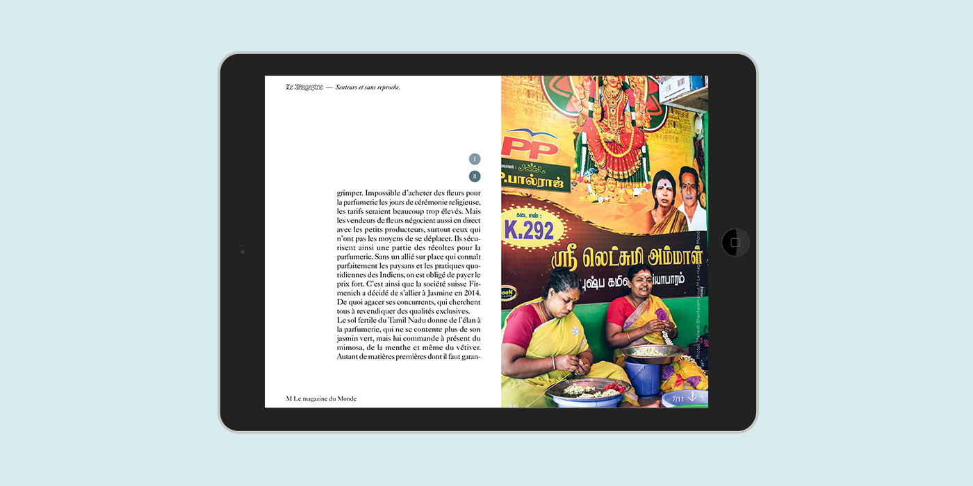 Réalisation et production de la publication digitale de M Le magazine du Monde pour iPad. Chaque semaine le contenu du magazine papier est remis en page pour sa version digitale, repensé pour un format différent et adapté pour une lecture à l'écran. Elle comprend également des enrichissements interactifs et l'ajout de contenus médias, photos ou vidéos.